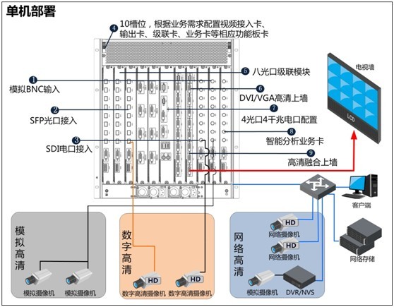 針對小規(guī)模的應(yīng)用,部署單臺設(shè)備,實(shí)現(xiàn)高清、標(biāo)清視頻的接入、編碼、存儲(chǔ)、顯示、業(yè)務(wù)應(yīng)用等。單機(jī)模式支持大80路HD-SDI和40路IPC HD信號同時(shí)輸入或者支持大320路模擬D1和160路IPC D1信號同時(shí)輸入,單機(jī)支持大160路高清輸出。