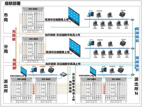 通過光傳輸技術(shù),系統(tǒng)支持光纖級聯(lián),滿足高清非壓縮數(shù)據(jù)對傳輸帶寬的要求,支持多機(jī)擴(kuò)展,滿足不同規(guī)模的需求,可實(shí)現(xiàn)從派出所-分局-市局-省廳的多級級聯(lián)管理應(yīng)用。