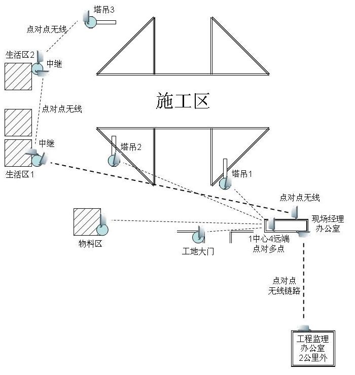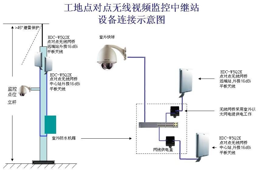 為保證某項目工程安全順利進行,公司管理人員能夠及時了解施工現(xiàn)場情況和施工進度,在工程現(xiàn)場安裝了合肥環(huán)宇智能工程有限公司的5.8GHz室外點對點、點對多點無線視頻監(jiān)控系統(tǒng),該系統(tǒng)由合肥監(jiān)控公司環(huán)宇智能的點對點、點對多點無線網(wǎng)橋和200W網(wǎng)絡(luò)高速球組成。