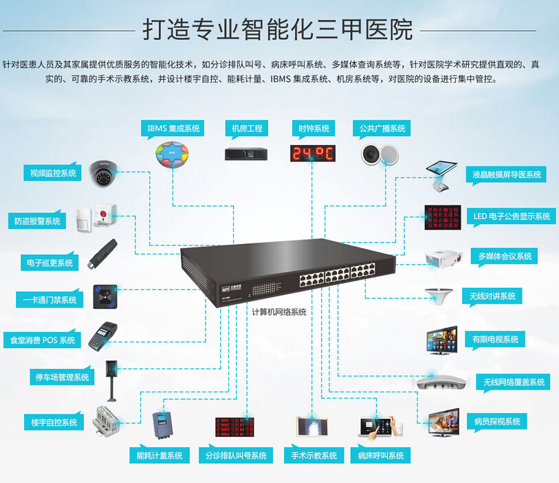 本解決方案包括:綜合布線系統(tǒng)、安全防護系統(tǒng)、網(wǎng)絡服務系統(tǒng)、出入人員探視安全管理和排隊呼叫、病房呼叫等系統(tǒng)組成。